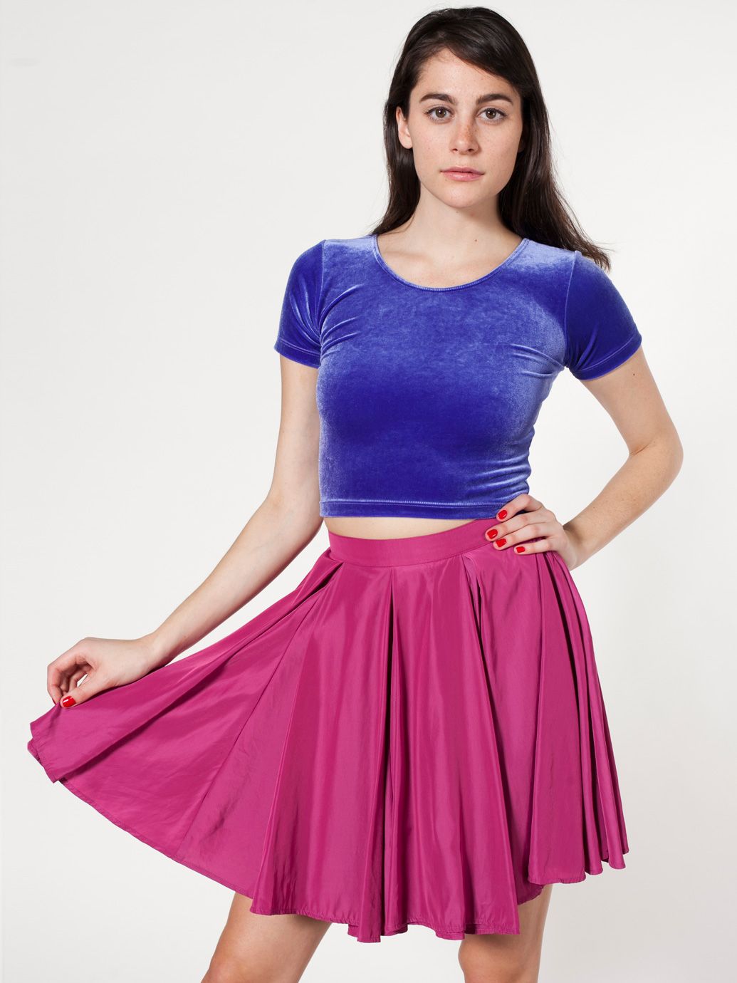 -Lea is wearing a textured pink dress with two different shades. Instead of going with a dress I chose a shirt and a skirt. For the skirt I picked out the Short Gore Skirt in Berry from American Apparel that costs $48.00. It's actually a pretty good price considering the fact that the skirt is 100% silk. Also for 15% off your first purchase sign up for their mailing list!
